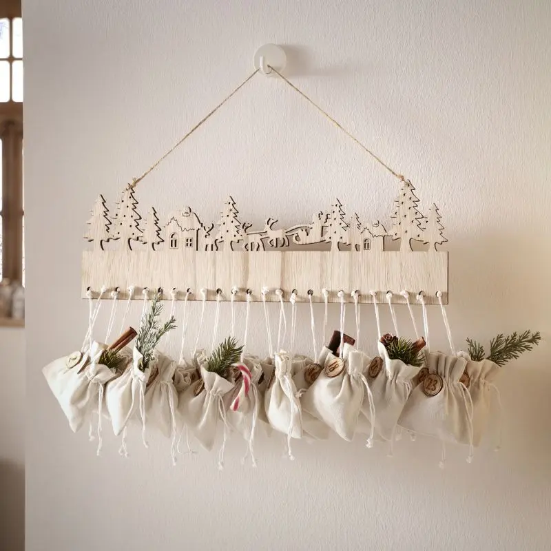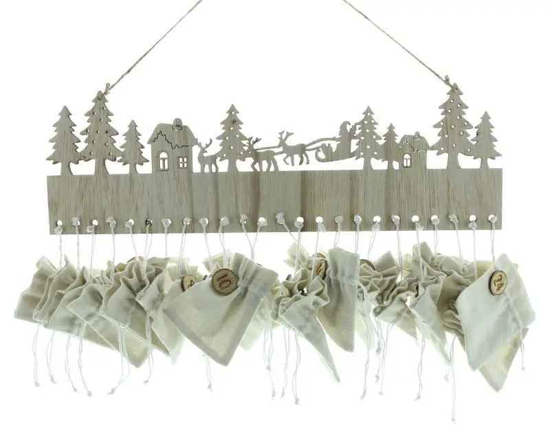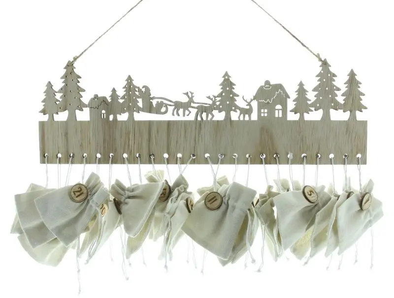 Set mit idyllischem Weihnachtsmotiv aus Holz zum Aufhängen und 24 wiederverwendbaren Stoffbeuteln zum Selberbefüllen. Ideal für selbst ausgewählte Überraschungen, Süßigkeiten oder persönlichen Botschaften.