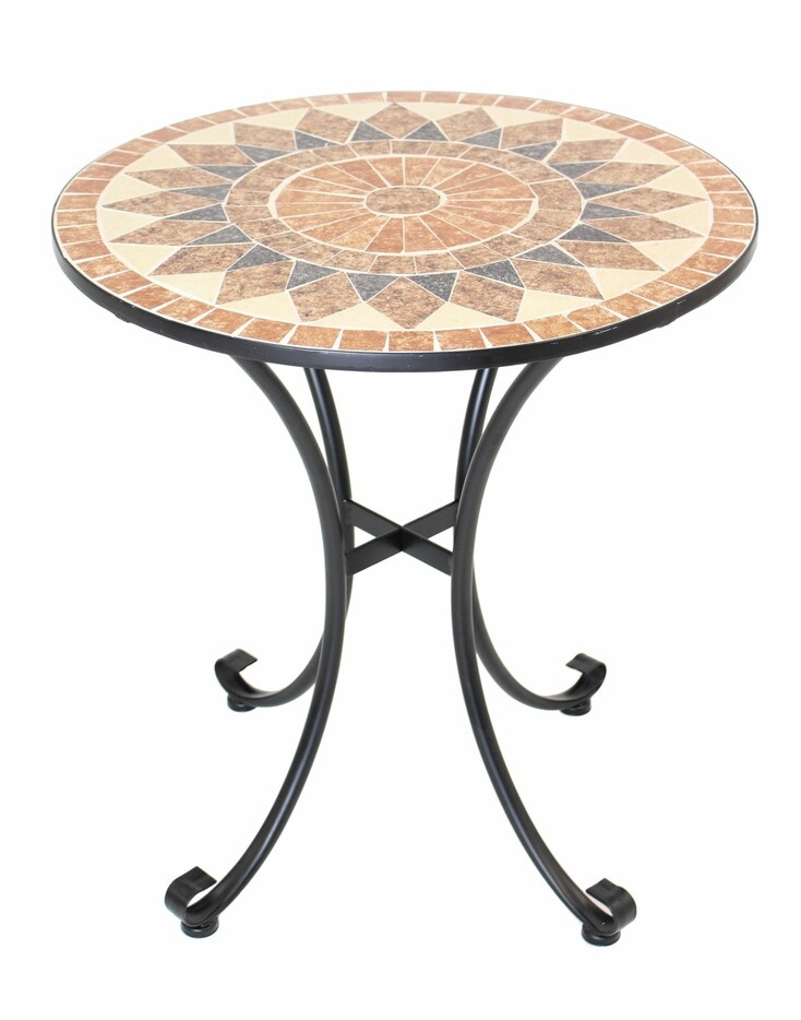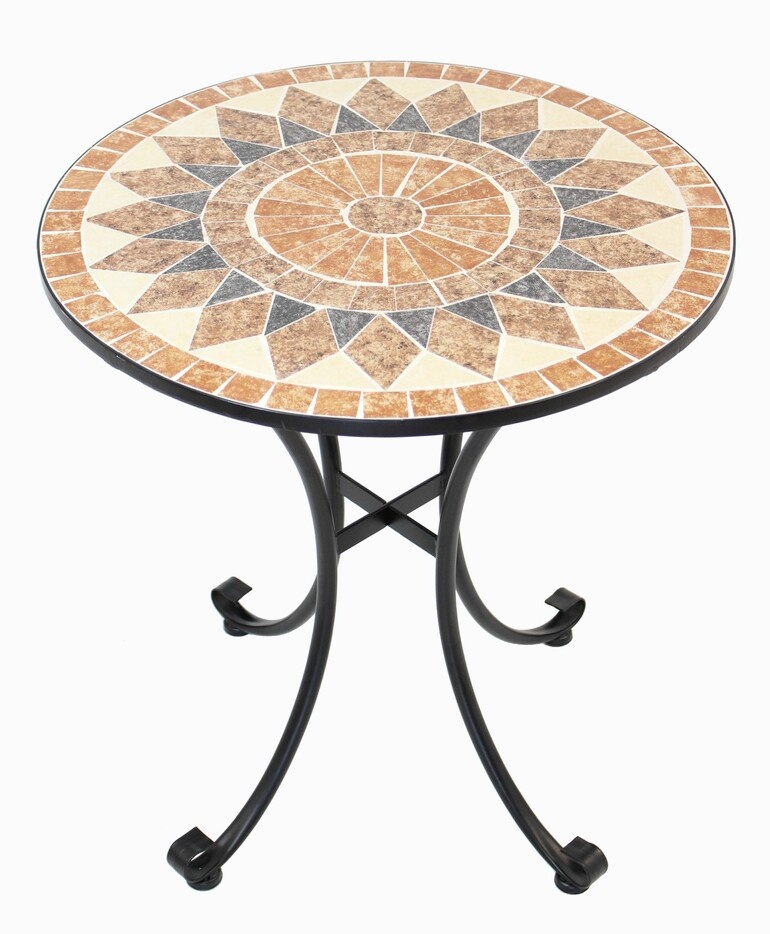 runder Metalltisch mit aufwändig gearbeiteter Tischplatte aus Natursteinmosaik