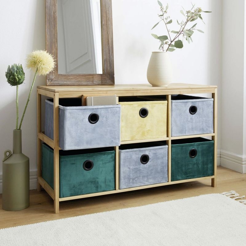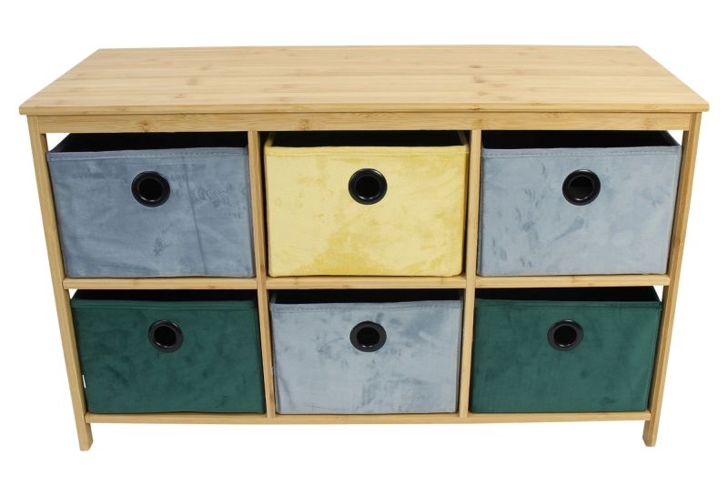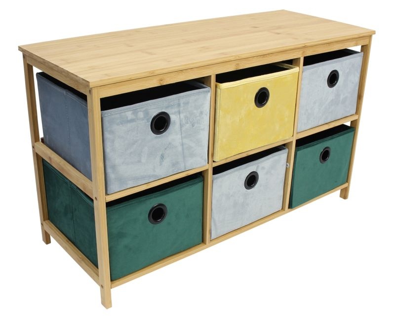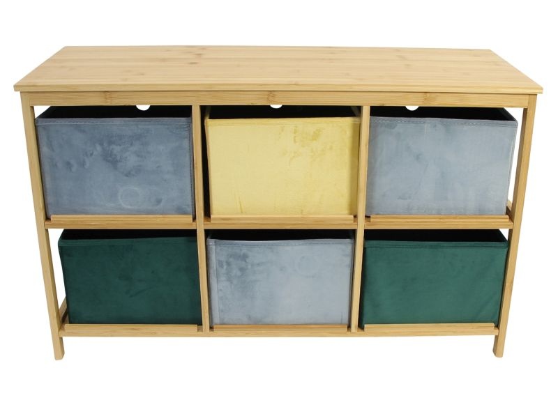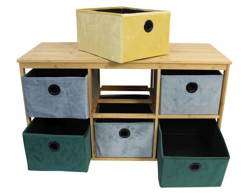 Eyecatcher in trendigem Design, naturfarbenes Bambusgestell, sechs herausnehmbare Aufbewahrungsboxen, buntes Textil in schimmernder Samtoptik, schwarze Kunststoffringe