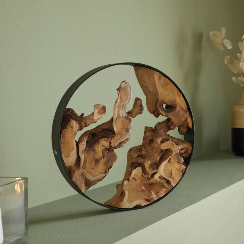Vielseitiges Deko-Objekt für Wand oder Tisch. Extravagantes Holz vom Maulbeerbaum mit mattschwarz lackiertem Metallring. Jedes Stück ein von der Natur geformtes Unikat, Form kann variieren. Ø 28 cm x 4 cm Höhe