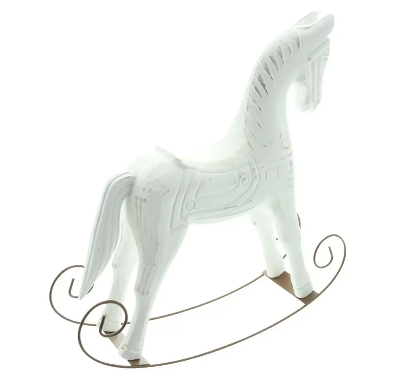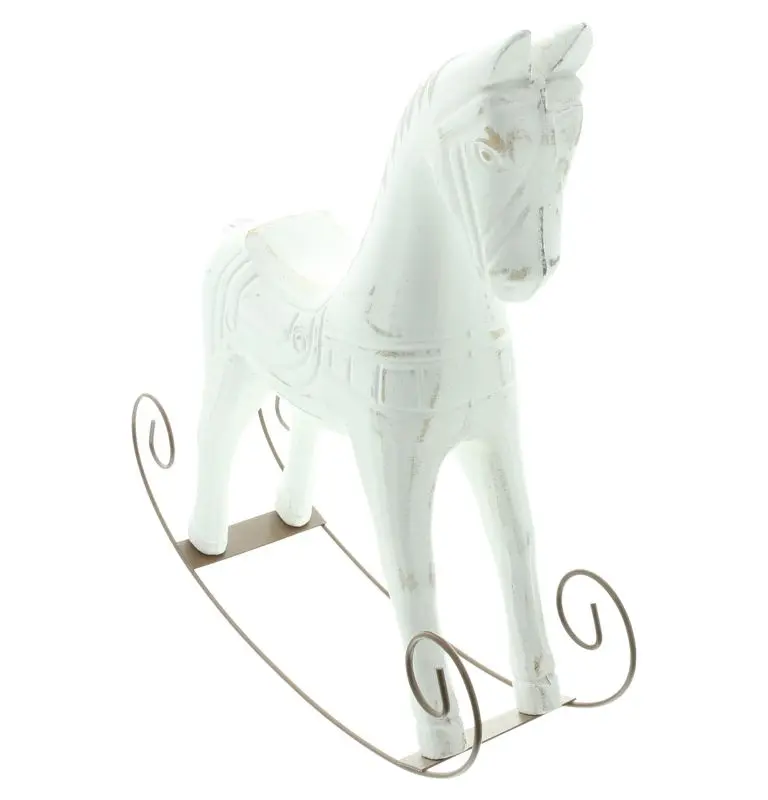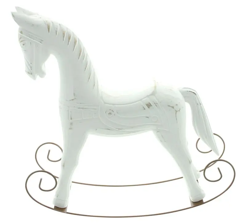Pferdchen aus weiß getünchtem MDF mit mattbraunen Metallkufen im Vintage-Flair