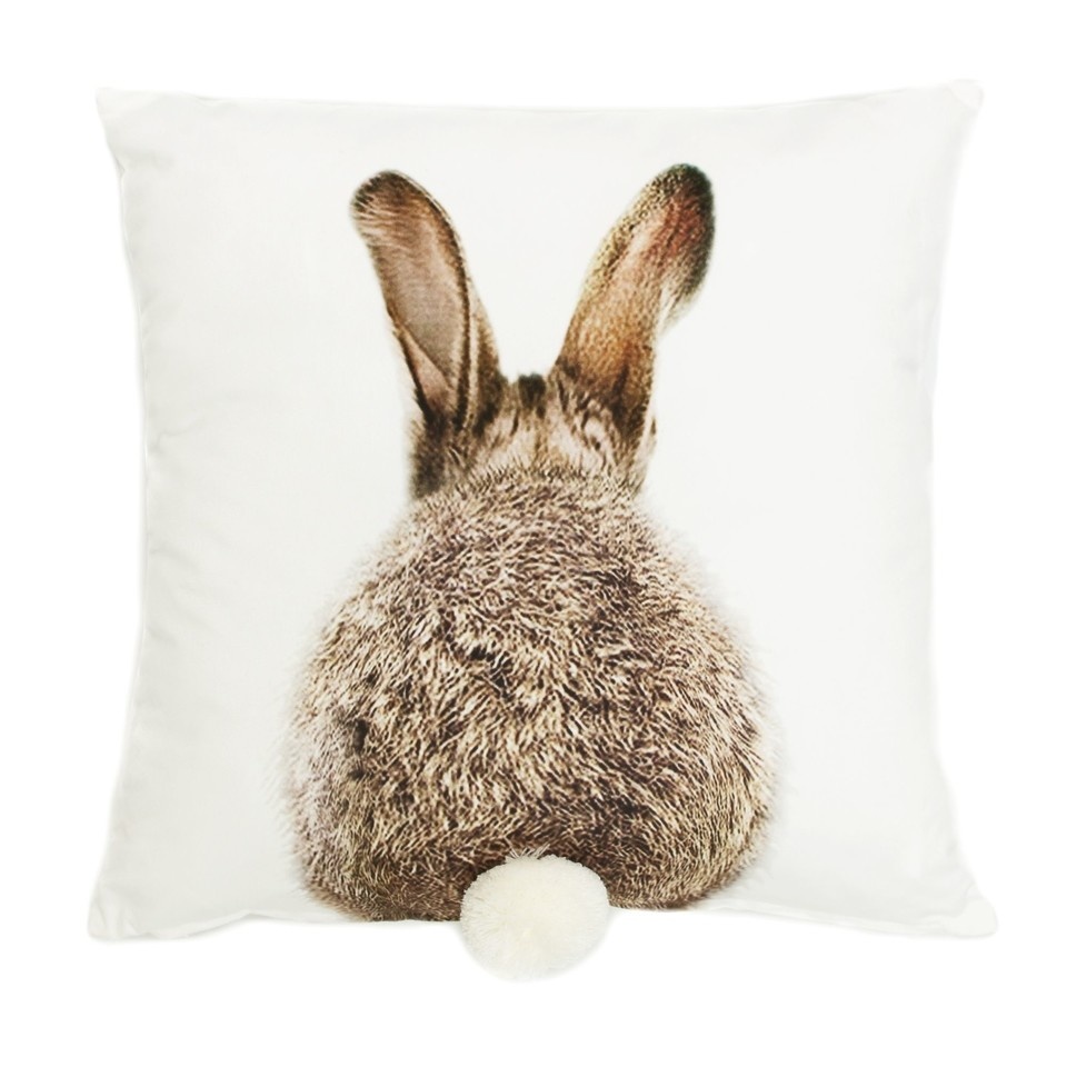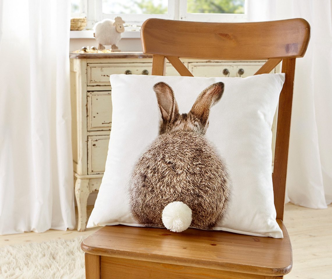 origineller Kissenbezug in Weiß mit Hasenmotiv und aufgesetztem Bommel-Schwänzchen, mit Reißverschluss