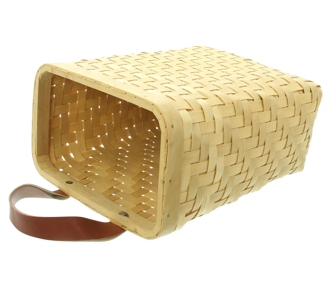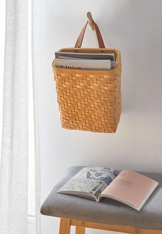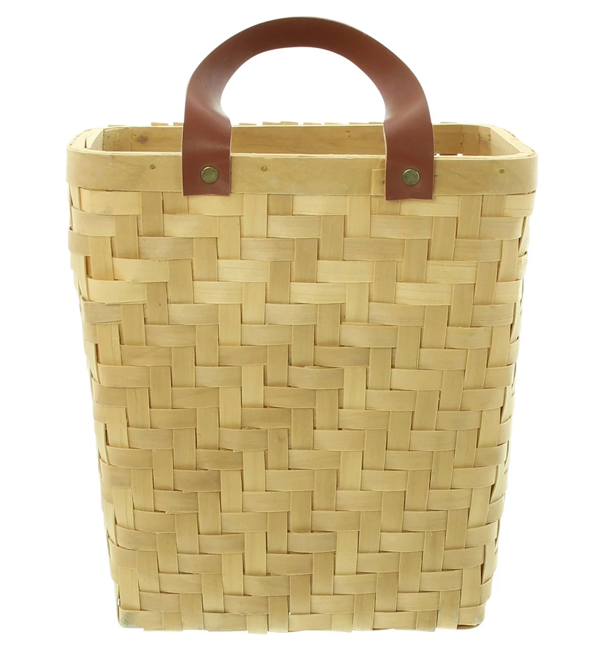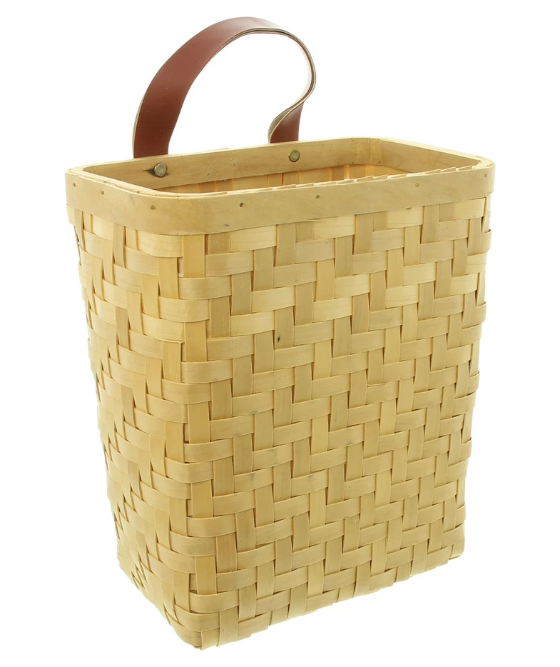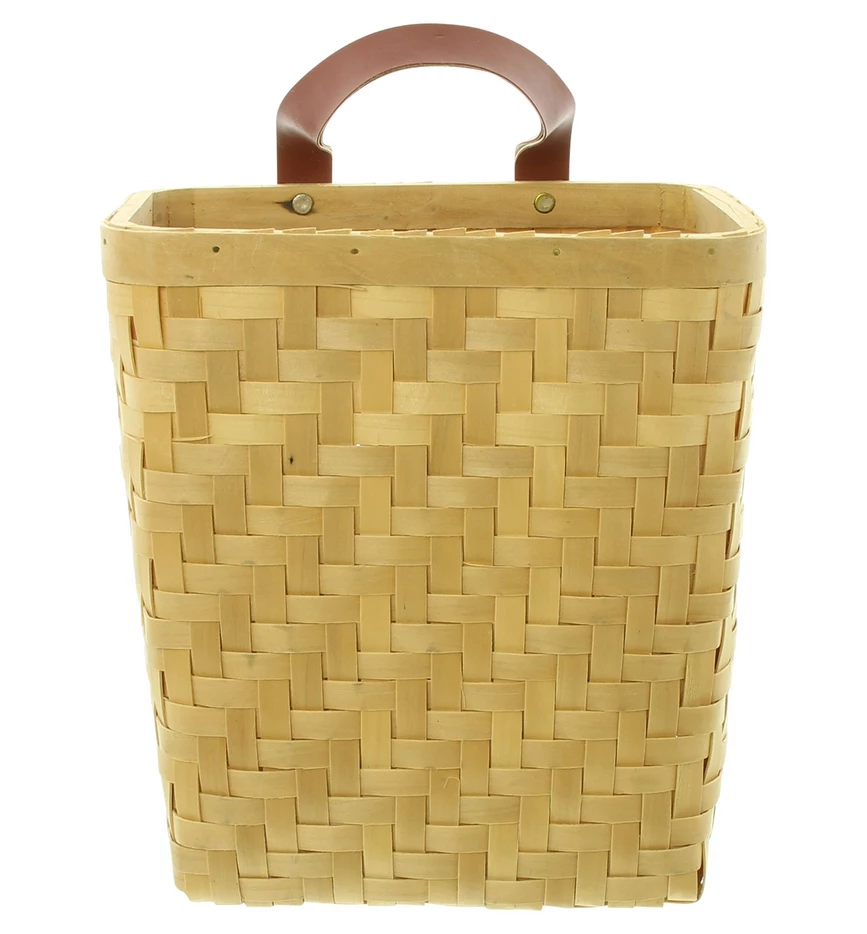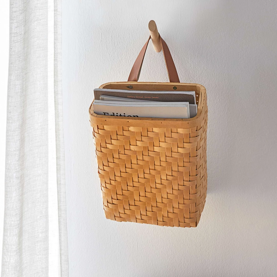 moderner Universalkorb zum Befestigen an der Wand, stabil geflochten, natürlicher Farbton, brauner Griff aus Kunstleder