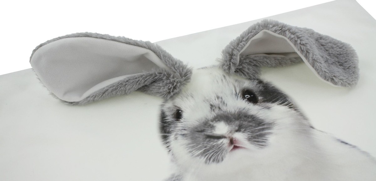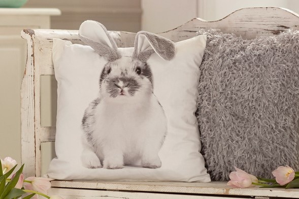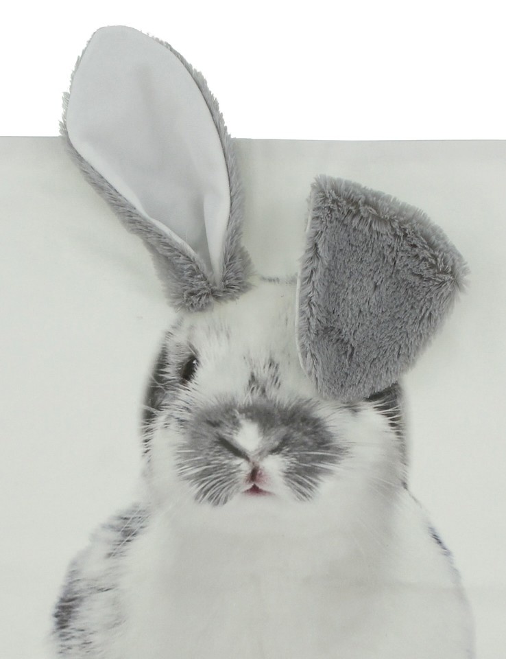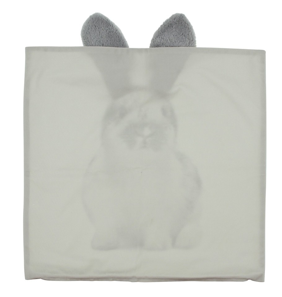 samtiger Kissenbezug in Cremeweiß und Veloursoptik mit Hasenmotiv und originell angenähten Plüschohren