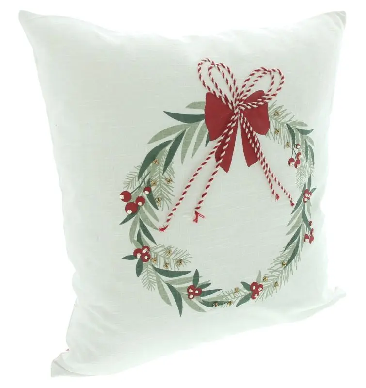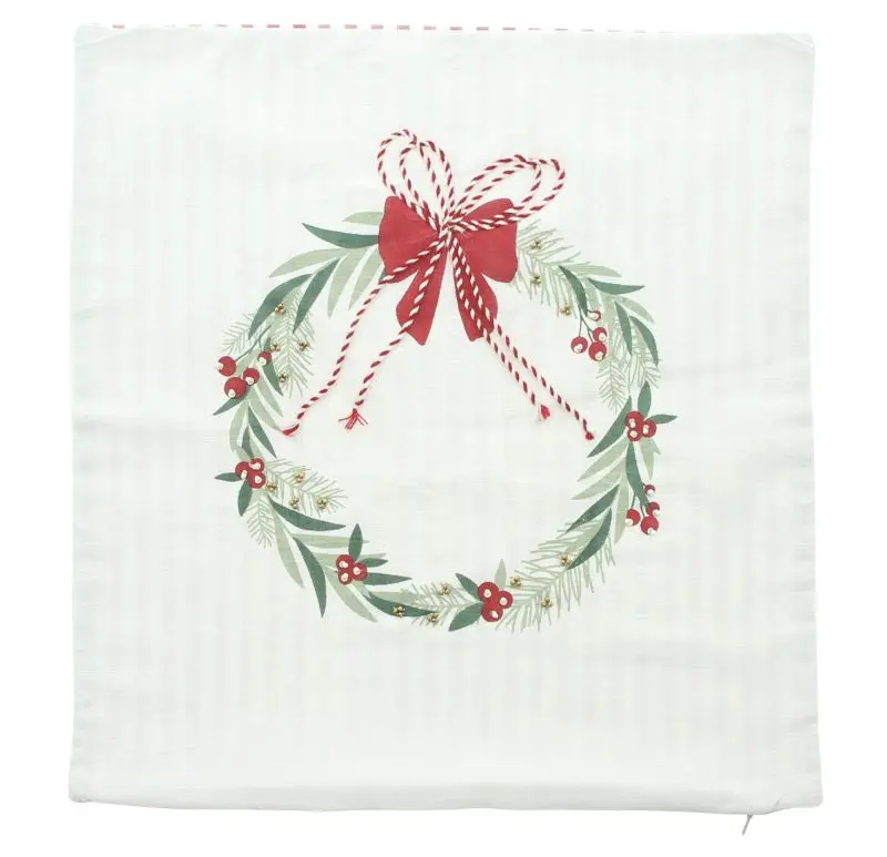 Qualität und Detailverliebtheit: Die Vorderseite der Kissenhülle präsentiert sich in einer eleganten, weißen Leinen-Optik und ist mit einem brillianten Motivdruck eines traditionellen Winterkranzes versehen. Feine Applikationen und Veredelungen sorgen für eine besonders hochwertige Haptik und eine dreidimensionale Optik.