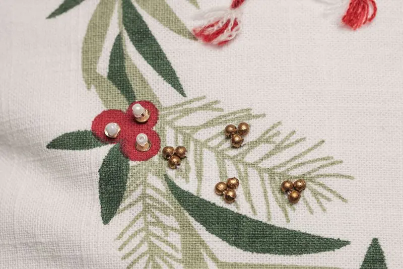 Vorderseite: weiße Leinen-Optik mit brilliantem Motivdruck und feinen Applikationen veredelt, Rückseite in klassischem Rot-Weiß-Streifen-Design