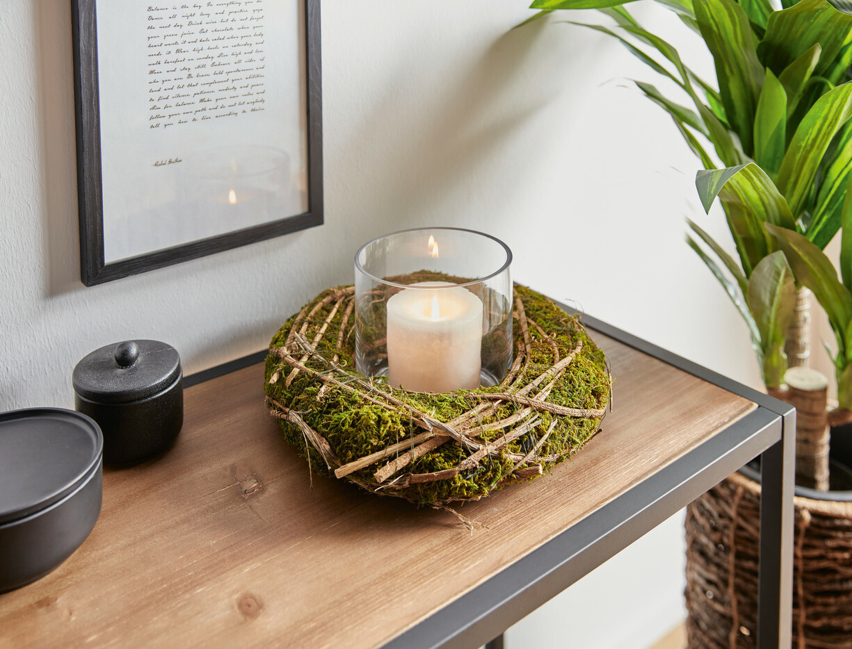 grünes Natur-Moos auf stabilem Metallrahmen, dekorativ mit Reisig umwickelt, vielseitig verwendbar