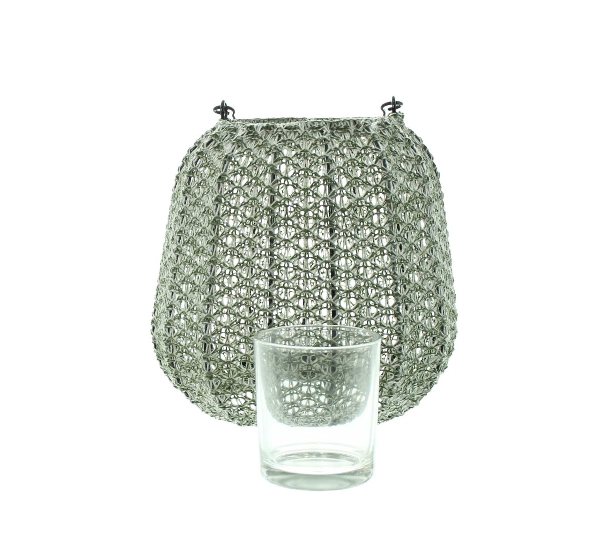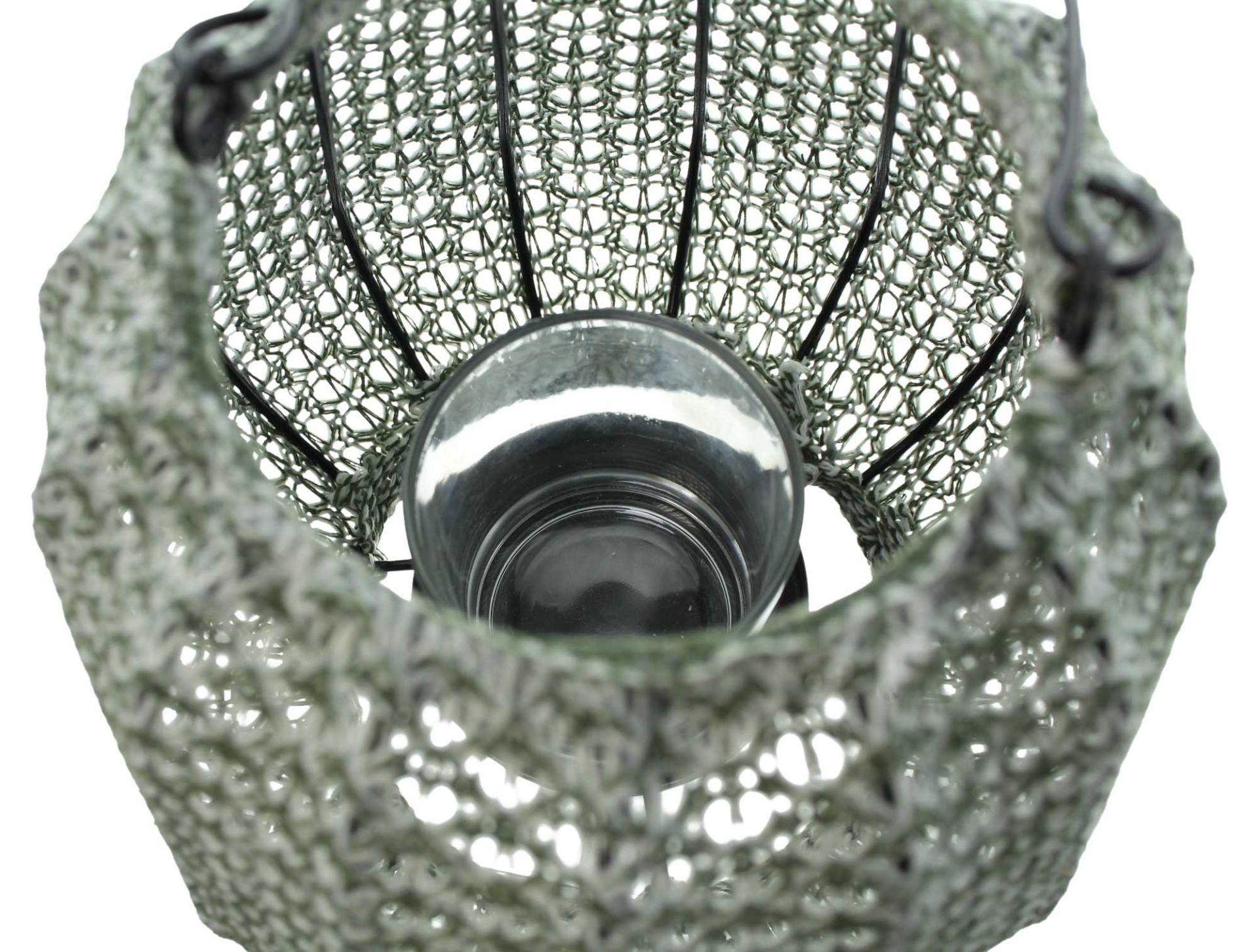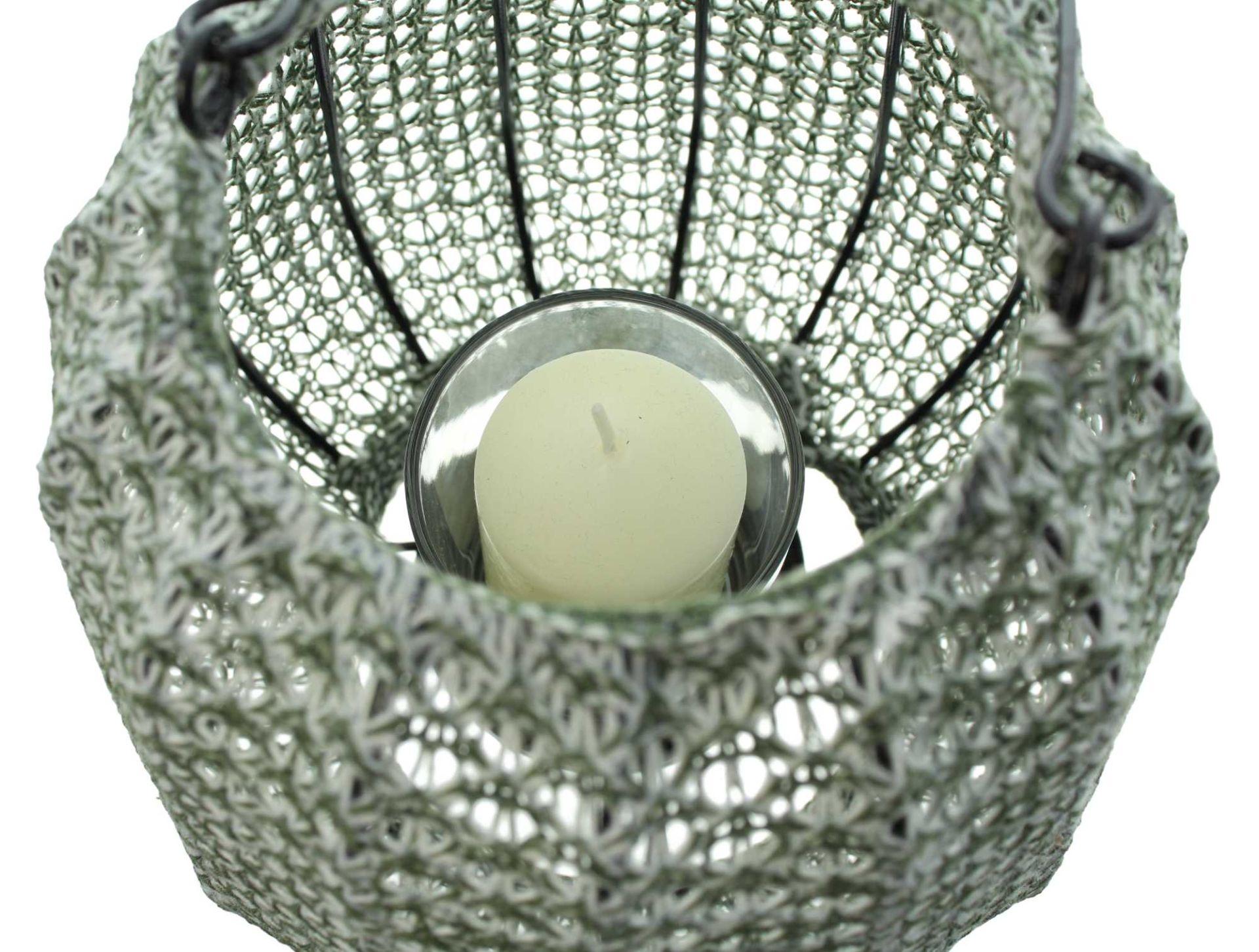 schöne Leuchteffekte durch kunstvoll gehäkeltes Garn, beschichtet, schwarzer Metallrahmen, beweglicher Henkel, herausnehmbarer Glaseinsatz