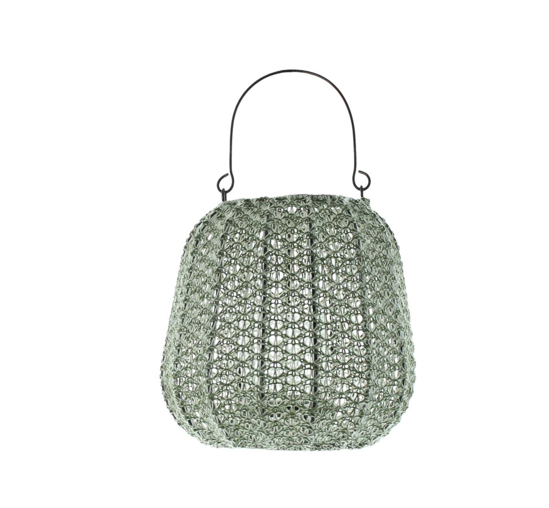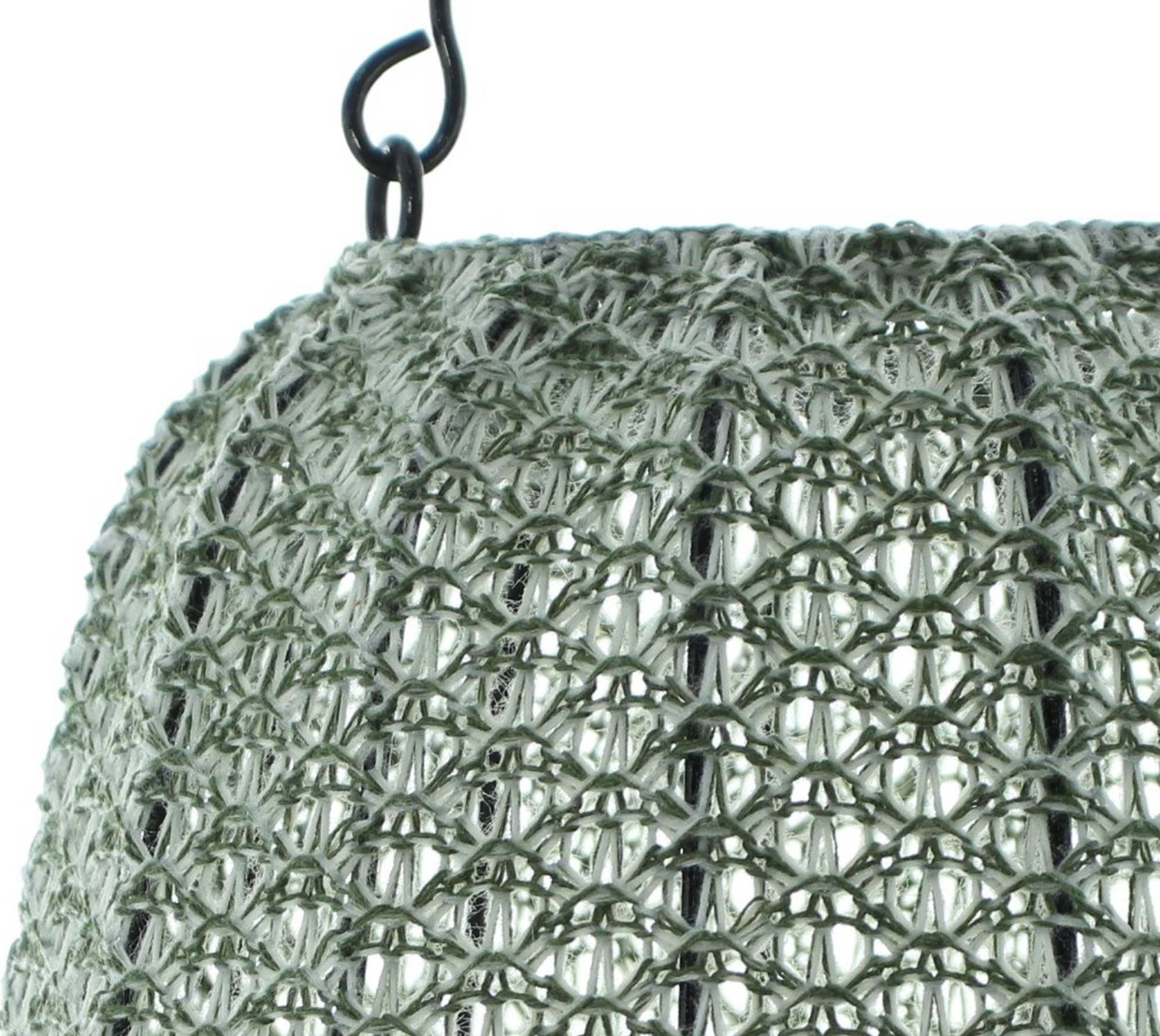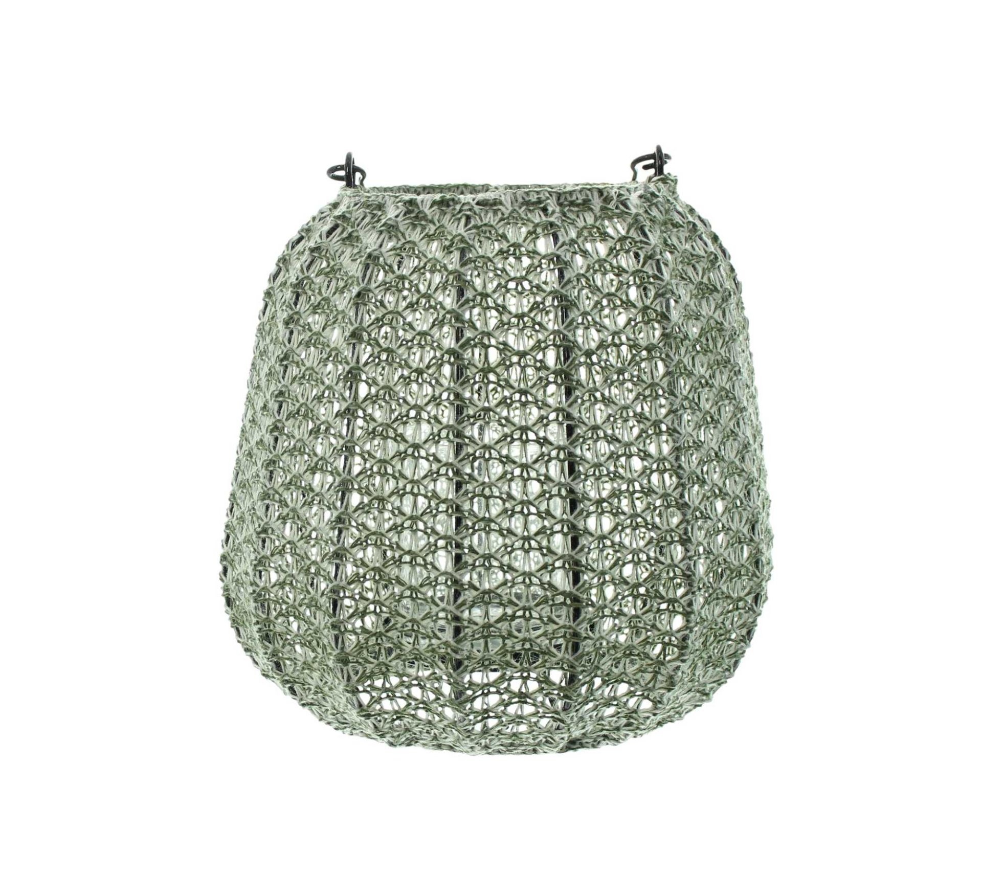schöne Leuchteffekte durch kunstvoll gehäkeltes Garn, beschichtet, schwarzer Metallrahmen, beweglicher Henkel, herausnehmbarer Glaseinsatz