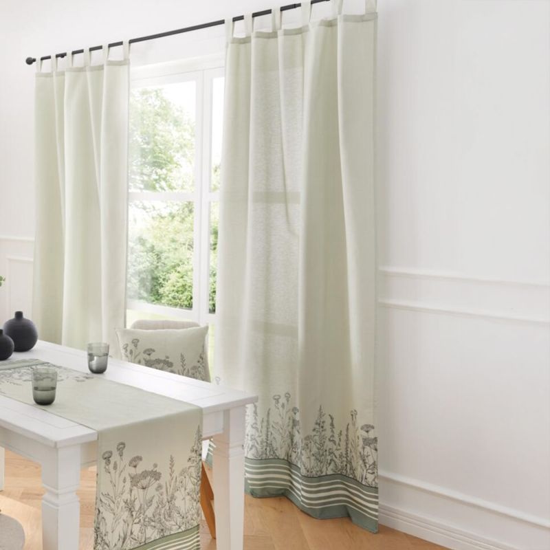 Holen Sie sich sommerliche Frische ans Fenster: Der halbtransparente Vorhang besticht durch seinen Botanik-Print auf hellgrünem Grund als dekorativen Abschluss am unteren Saum. Die hochwertige Panama-Qualität sorgt für einen edlen Fall und tolles Licht.