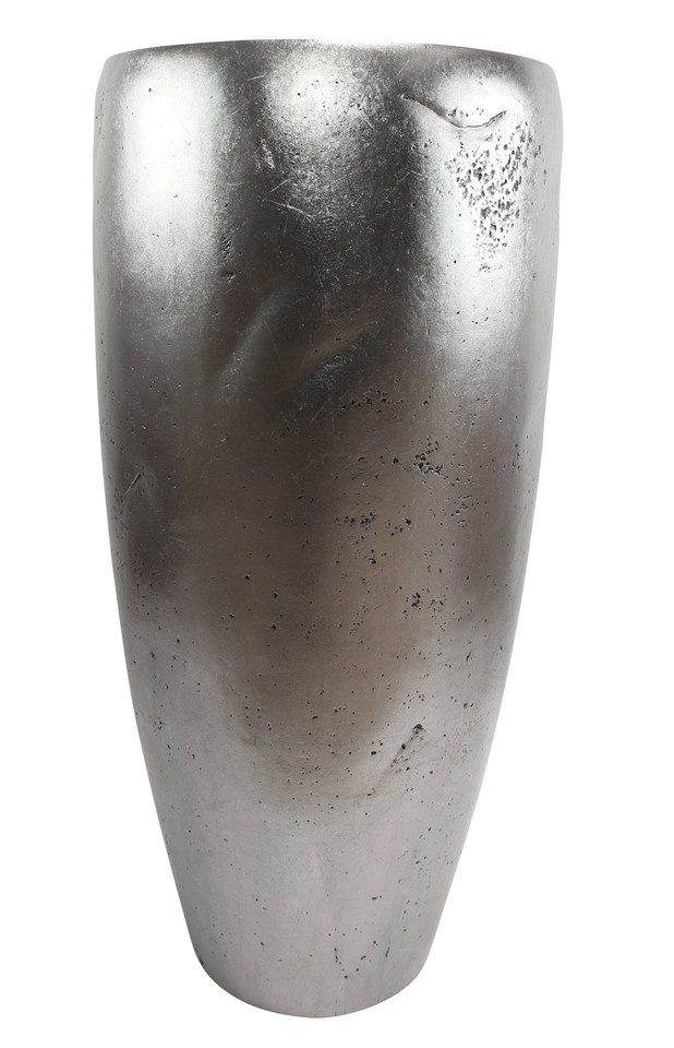 aufwändig gearbeitete Pflanzsäule aus Polystein mit silberfarbener Oberfläche und herausnehmbaren Pflanzeinsatz aus Kunststoff