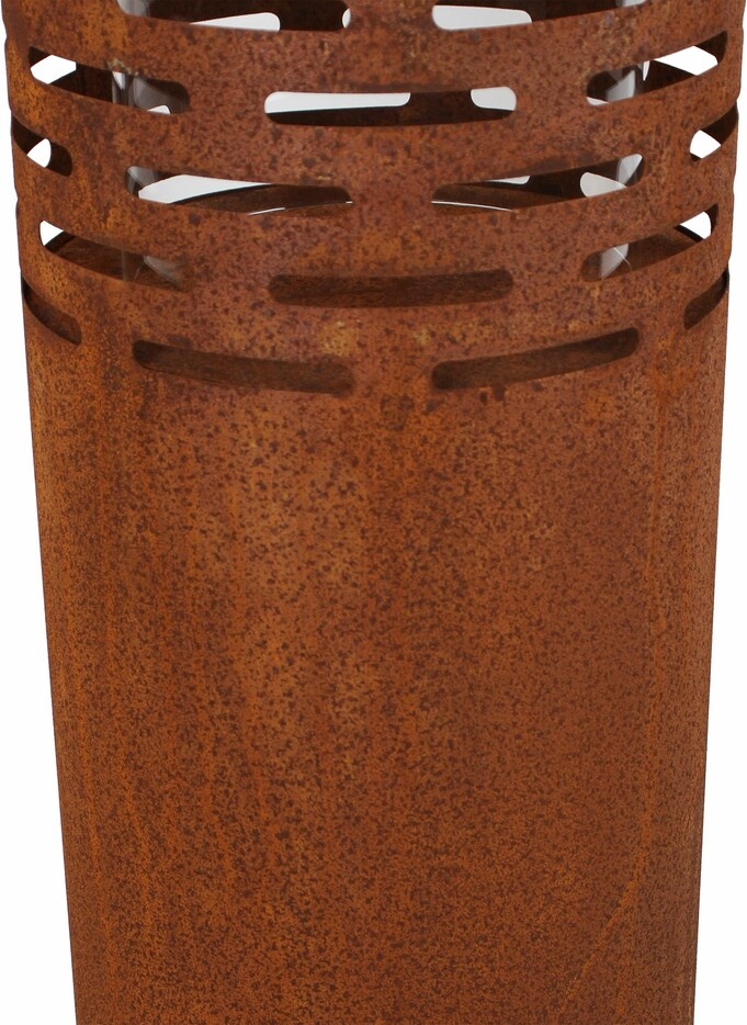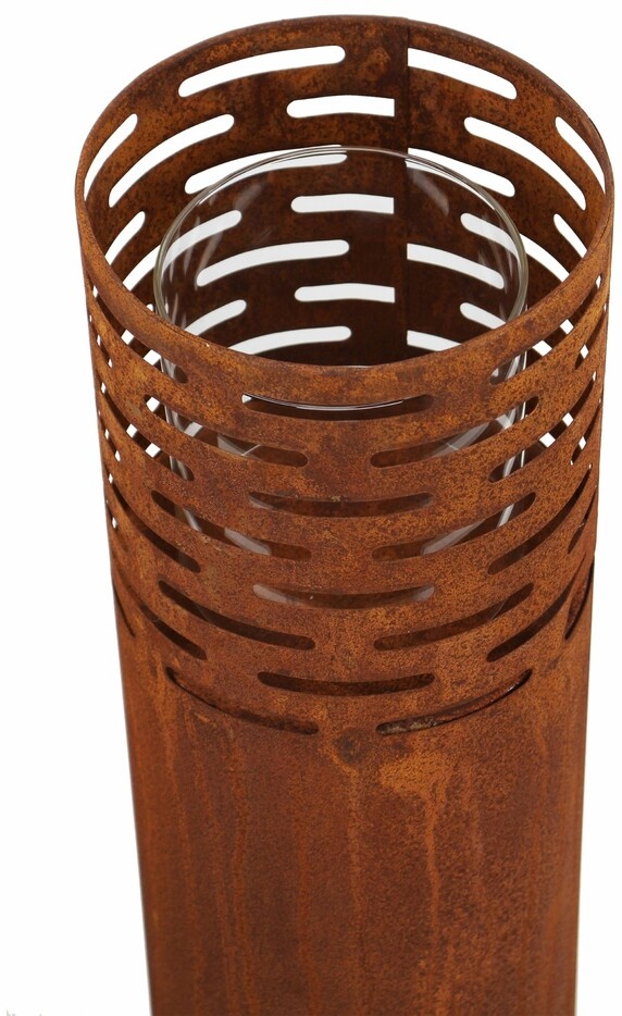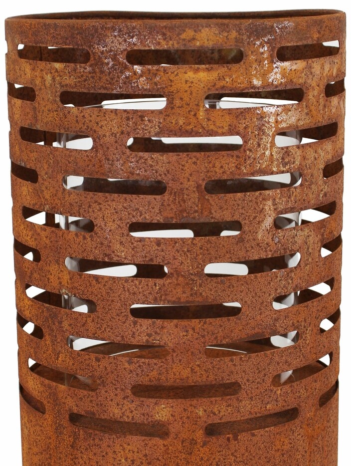 eindrucksvolle Windlicht-Säulen im rostigen Design mit Ausstanzungen und herausnehmbarem Glaszylinder, auch für den Outdoorbereich geeignet